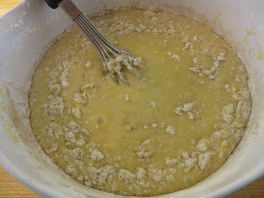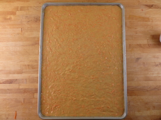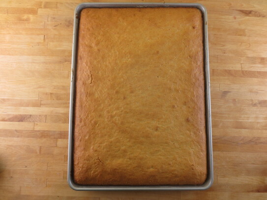 Aluatul se toarnă în tava de copt şi se coace cam 40 de minute. Blatul se scoate apoi din cuptor şi se lasă să se răcească.