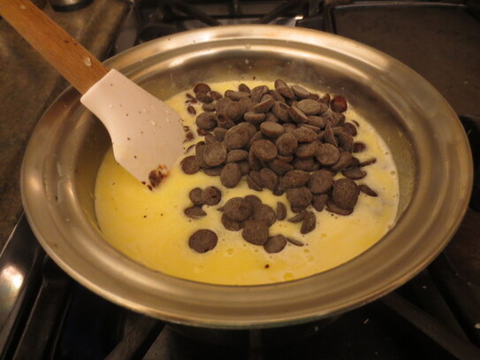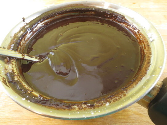 Se ia de pe foc, se adaugă ciocolata şi untul şi se lasă deoparte aproximativ 5 minute, până când acestea se topesc de la căldura smântânii fierte. După ce au trecut cele 5 minute, se amestecă până când devine ca o pastă groasă. Se lasă deoparte să se răcească.