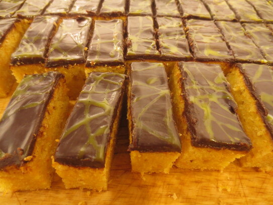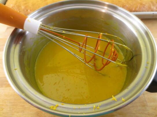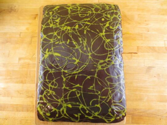 Glazura de ciocolată se întinde peste blat, după care se ornează cu glazura de ciocolată portocalie.