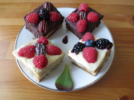 Prăjitură cu nucă, ciocolată şi fructe