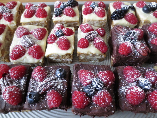 Tradiţionala prăjitură cu nucă, elegantă şi rafinată, se prepară cu precădere de sărbători, onomastice sau alte evenimente festive. Nuca pralinată din blatul pufos şi crema de unt, îi dau prăjiturii un gust minunat. În varianta pe care v-o propunem, glazura de ciocolată albă şi amăruie împreună cu fructele (zmeură, mure şi afine) folosite la ornat, dau prăjiturii un aer festiv, adăugând, pe lângă culoare, varietate şi rafinament.