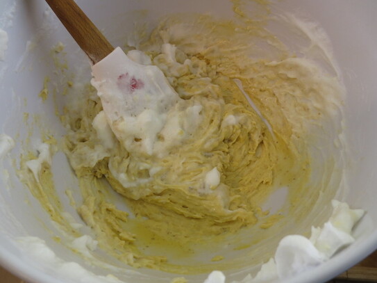 Separat, într-un castron de mărime medie, se freacă gălbenuşurile cu cele 5 linguri de zahăr, până când gălbenuşurile se deschid la culoare. Se adaugă treptat untul adus la temperatura camerei, şi nuca măcinată. Praful de copt se amestecă cu făina şi se adaugă alternând cu jumătate din spuma de ou. Se amestecă uşor cu o spatulă cu mişcări circulare de jos în sus.