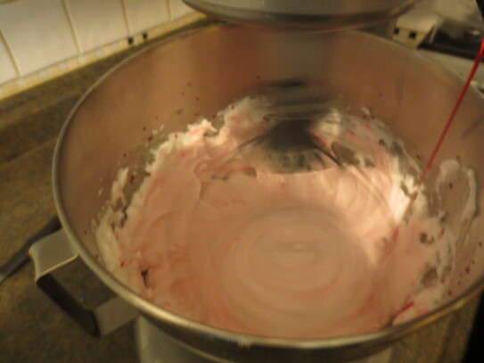 Se toarnă apoi dulceaţa de trandafiri fierbinte, în fir subţire, în timp ce spuma se bate la viteză medie. După ce dulceaţa s-a omogenizat, se măreşte viteza şi se bate în continuare cam 10 minute, până când spuma se răceşte. Spuma va creşte în volum destul de mult, va fi fermă şi extrem de fină şi pufoasă.