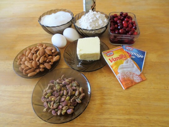 25-30 sâmburi de fistic şi/sau migdale feliaţi pe lungime, 200 g merişoare crestate şi presărate cu zahăr