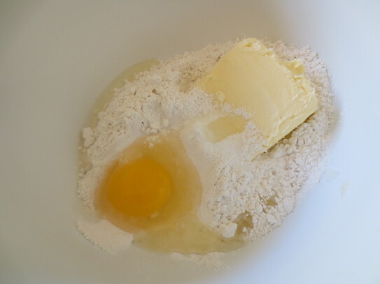 1 cană de făină, 1 lingură de zahăr, un praf de sare, 100 g unt tăiat în cubuleţe, un ou (sau 6 linguri de apă rece)