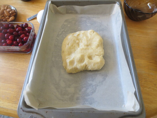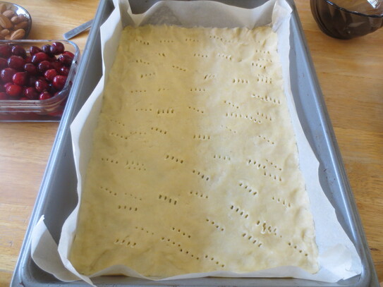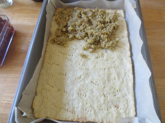 Pasta obţinută se întinde uniform peste crustă. Pe deasupra se presară sâmburii feliaţi de migdale/fistic, apoi se pun merişoarele, în şiruri, lăsând câţiva centimetri distanţă între ele. În lipsa merişoarelor se pot folosi jumătăţi de vişine sau alte fructe mici pe care le aveţi la îndemână.