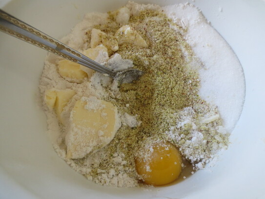 Într-un castron se pun toate ingredientele uscate: fisticul şi migdalele măcinate, apoi făina şi zahărul şi se amestecă bine.