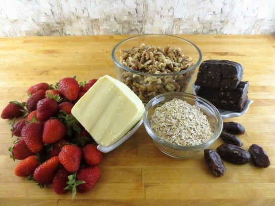 Căpşunile proaspete se pot folosi cu succes la prepararea unei prăjituri cu fulgi de ovăz, deosebit de fragedă şi aromată. Aluatul este bogat în fibre datorită fulgilor de ovăz, dar şi a curmalelor, care pe lângă aportul ridicat de fibre, sunt suficient de dulci pentru a substitui zahărul. În loc de faină, se folosesc nuci sau migdale măcinate.