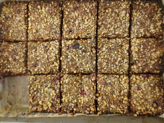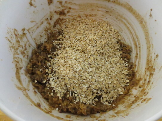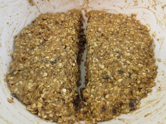 Se pun deoparte 6 linguri de nuci, iar restul se amestecă într-un castron, împreună cu pasta de curmale (sau curmalele tăiate mărunt) şi untul aflat la temperatura camerei. Când ingredientele sunt bine încorporate se adaugă fulgii de ovăz şi sarea şi se amestecă în continuare până ce compoziţia devine ca o pastă groasă. Pasta obţinută se taie în jumătate.