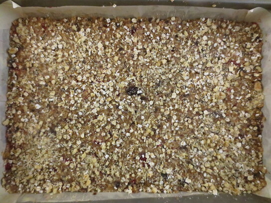 Deasupra pastei se presară un strat subţire de fulgi de ovăz şi nuca măcinată rămasă.