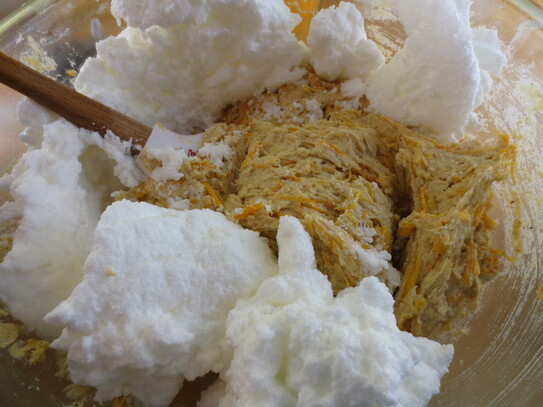 Mai întâi, se începe cu prepararea compoziţiei de bază. Se separă gălbenuşurile de albuşuri. Albuşurile se bat spumă, adaugându-se pe rând puţină sare. Untul se freacă cu zahărul şi vanilia, până când devine ca o cremă spumoasă. Se adaugă pe rând gălbenuşurile amestecând pentru a le încorpora bine.