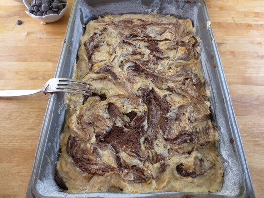 Jumătate din compoziţia de cacao se toarnă în tavă , apoi peste aceasta se întinde jumătate din amestecul de dovleac. Se pune apoi cealaltă jumătate din compoziţia de cacao. Se ia o furculiţă şi se amestecă straturile pentru a le dă diferite forme. De deasupra se toarnă compoziţia de dovleac rămasă.