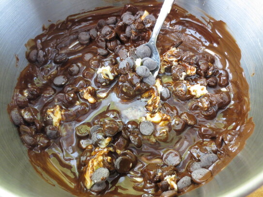 Ciocolata de menaj mărunţită se pune într-un vas la foc mic şi se adaugă untul. Se amestecă până când ciocolata devine sticloasă, apoi se ia de pe foc. Dacă se lasă prea mult ciocolata se brânzeşte. La fel de bine ciocolata se poate topi folosind un vas pe aburi.