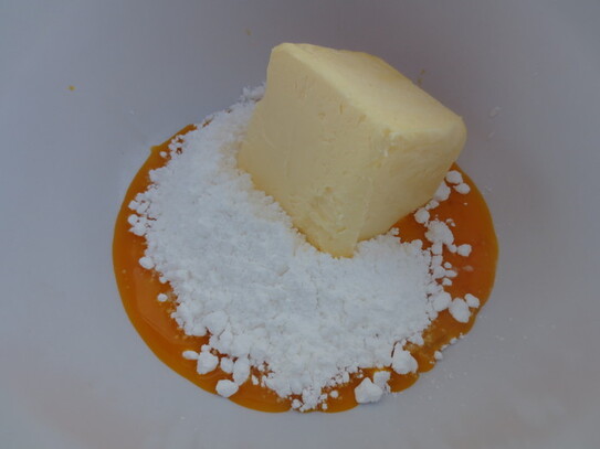 Pentru prepararea blatului se freacă zahărul pudră şi cele patru gălbenuşuri, apoi se adaugă treptat untul moale ţinut la temperatura camerei.