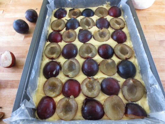 Mai întâi se desfac prunele în două şi se îndepărtează sâmburii, după care se lasă deoparte. Tava de prăjitură (25/40 cm) se tapetează cu hârtie de copt, iar cuptorul se încălzeşte la 175C.