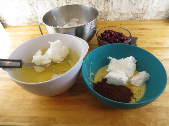 Se împarte aluatul în două parţi egale: într-un vas se pun 2 linguri de cacao, iar în celalat se pun 2 linguri de făină şi se amestecă uşor alternându-se cu spuma bătută din cele 5 albuşuri, amestecând prin mişcări uşoare de sus în jos până când aluatul de blat se omogenizează.