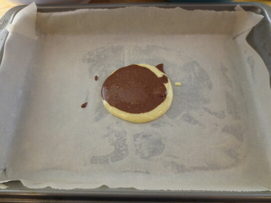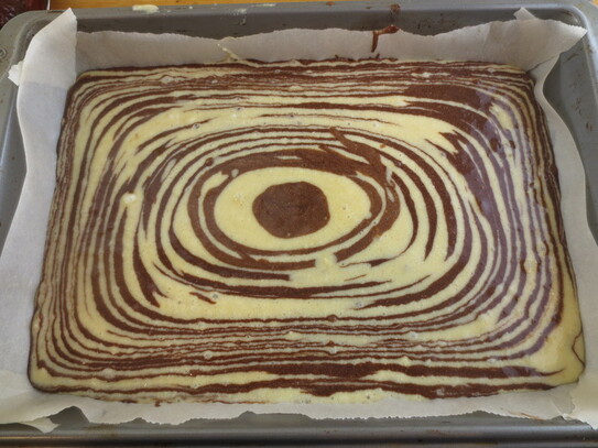 Se toarnă apoi în tavă compoziţiile de aluat, în felul următor: în mijlocul tăvii, se toarnă o lingură din aluatul de culoare galbenă , peste care se toarnă o lingură din aluatul de cacao. Se alternează în continuare câte o lingură de compoziţie galbenă, peste care se pune o lingură de aluat cu cacao, până când se termină ambele compoziţii. În final vor rezulta ovale concentrice, asemănătoare cu modelul blanei de tigru (de unde vine şi denumirea).