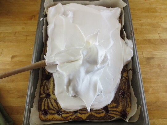 După ce au trecut cele 30 de minute, tava se scoate din cuptor. Spuma bătută se întinde pe deasupra într-un strat uniform.