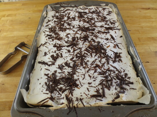 Când este gata, prăjitura se scoate din cuptor şi se lasă 10 minute în tavă să se răcească uşor. Folosind o răzătoare sau o ustensilă de curăţat legume, se rade ciocolată peste stratul de bezea.
