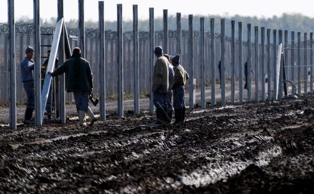 Muncitorii construiesc un gard la frontiera ungaro-sârbă, în apropiere de satul Gara, Ungaria, 27 octombrie 2016. (Csaba Segesvari/AFP/Getty Images)