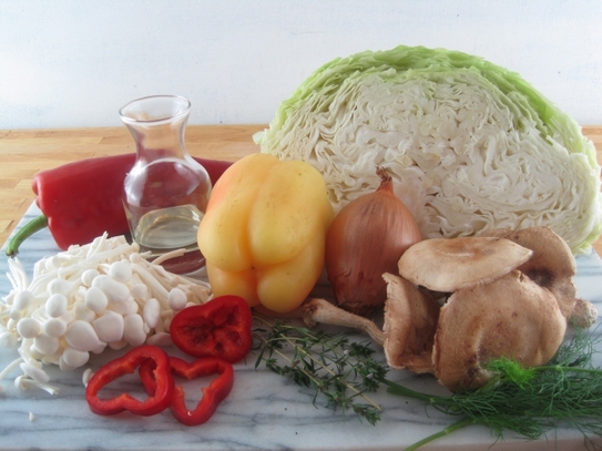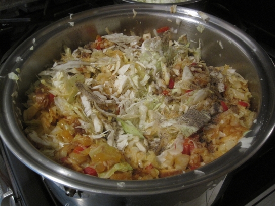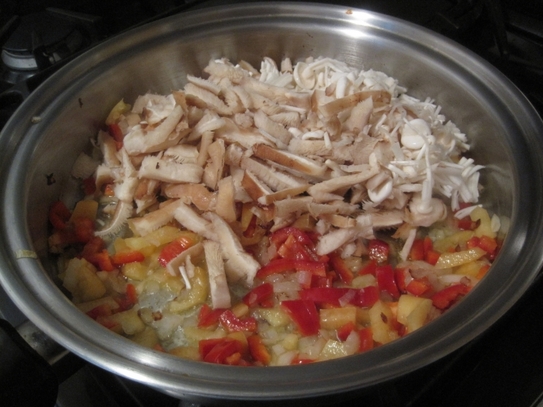 În cratiţa pe care vrem să o punem la cuptor, adăugăm ulei apoi începem să călim ceapă şi ardeiul tăiate mărunt. După ce ceapă se înmoaie, se adăugă ciupercile, apoi varza tăiată cât mai fin. După ce varza a început să fiarbă bine, se adaugă roşiile tăiate (sau sucul de roşii), piper şi sare dacă mai este nevoie, amestecând în continuare.