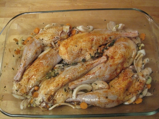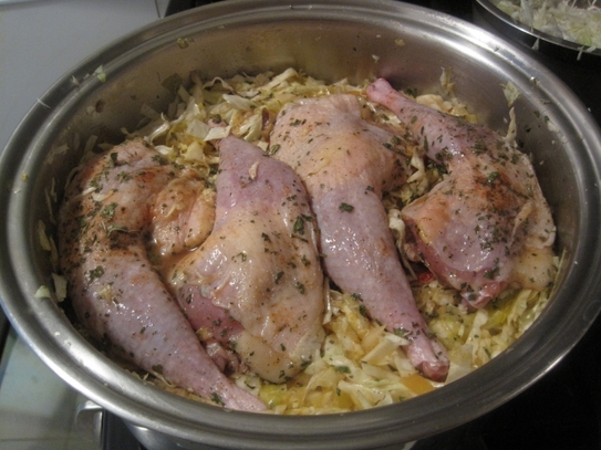 Se aşează pulpele de prepeliţă pe patul de varză, având grijă să punem puţin şi pe deasupra pulpelor.