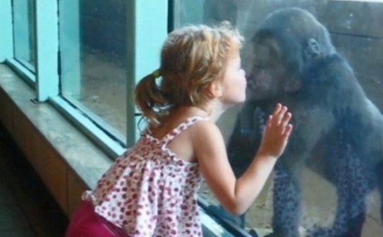 În vizită la o grădină zoologică, o fetiţă a reuşit să devină pentru câteva minute cea mai bună prietenă a unui pui de gorilă. Ea a imitat întocmai mişcările micuţei gorile, reuşind să stabilească o conexiune emoţionantă între cele două specii, uitând de faptul că îi desparte o întreagă teorie a evoluţiei speciilor.
