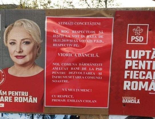 „Stimaţi concetăţeni, vă rog respectuos să ieşiţi la vot în data de 10.11.2019 şi să votaţi PSD, respectiv pe Viorica Dăncilă. Noi, comuna Dărmăneşti, am luat bani de la PSD pentru dezvoltarea şi înfrumuseţarea comunei noastre. Vă mulţumesc. Cu respect, primar Emilian Ciolan”, a fost mesajul scris de primarul din Dărmăneşti pe afişele electorale cu care a împânzit comuna.