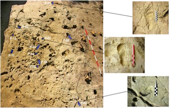 Amprentele diferitelor specii se intersectează reciproc şi se suprapun cu cele ale fiinţelor umane, indivizi în parte adulţi şi în parte copii de 1, 2 şi 3 ani. În special, cele ale unui micuţ care încă nu se ţinea prea bine pe picioare şi se balansa: amprenta picioruşului său se repetă în timp ce stă pe călcâie, dar şi o serie de degeţele, parţial suprapuse datorită repetării mişcării.