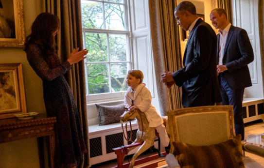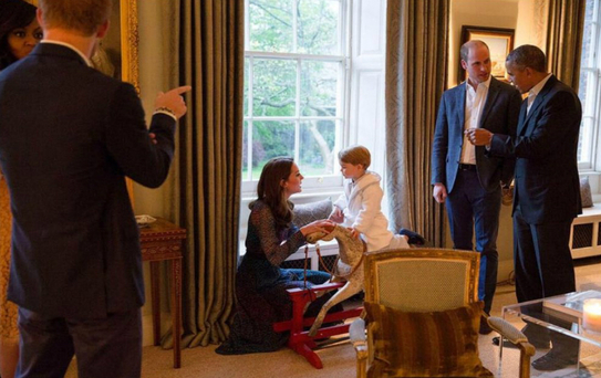 Prinţişorul George era pregătit să meargă la culcare, îmbrăcat deja pentru noapte: un halat în culoare pastel purtate peste pijama. Cu toate acestea, a rămas treaz şi înainte să meargă la culcare, a vrut să-l primească la Kensington Palace pe preşedintele SUA Barack Obama şi pe Prima Doamnă Michelle, tocmai sosiţi la palat pentru cina oferită de Ducii de Cambridge şi Prinţul Harry.