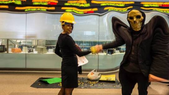 Se ştie că în fiecare an, pe 31 octombrie, pe continentul american se sărbătoreşte Halloween, o sărbătoare în care oamenii celebrează recoltele, cântă, dansează, şi îşi spun poveşti înfricoşătoare cu fantome. Protestatarii româno-canadieni, purtând măşti aurii, nu au găsit ceva mai 'înfricoşător' de Halloween decât o corporaţie care vrea să distrugă patru munţi şi să relocheze sute de oameni pentru a face loc unui lac de cu reziduuri de cianură.