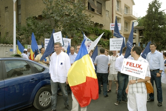 În faţa sediului de campanie a lui Băsescu, ei au fluturat steaguri tricolore şi au strigat: "Ce vrea poporul, jos cu dictatorul", "Dacă te ţine, baie de mulţime", "Băsescu judecat pentru ce a furat".