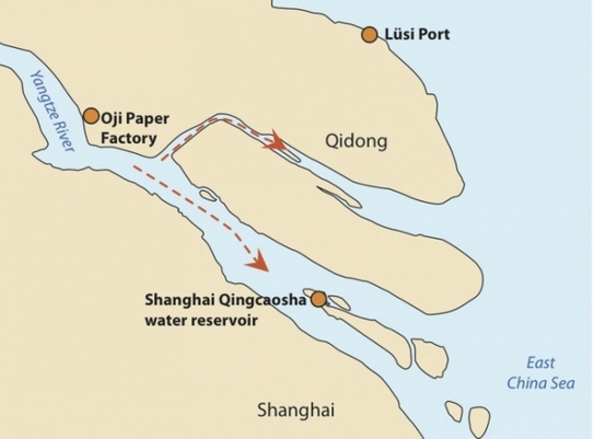 Un activist online a postat o hartă ce arăta cum apele poluate curg în aval de la Oji Paper Co. în Zona de Dezvoltare Economică Nantong, ajungând la rezervorul Qingcaosha, care oferă 7,19 de milioane de metri cubi de apă zilnic celor 40 de milioane de locuitori din Shanghai.