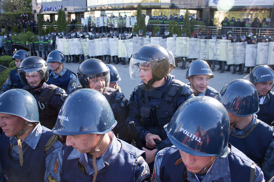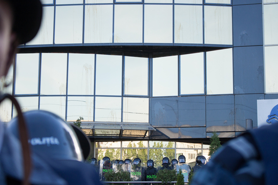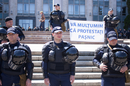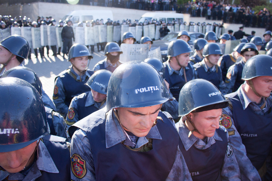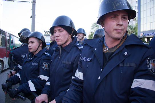 Este de menţionat fapul că în timpul manifestaţiilor de duminică din autocarele amplasate chiar în faţa Global Business Centre (GBC) a coborât o mulţime de poliţişti care au înconjurat clădirea. Totodată, în faţa forţelor de ordine înarmate şi foarte bine echipate din jurul GBC au fost amplasaţi tineri, studenţi ai Academiei de Poliţie din Chişinău.