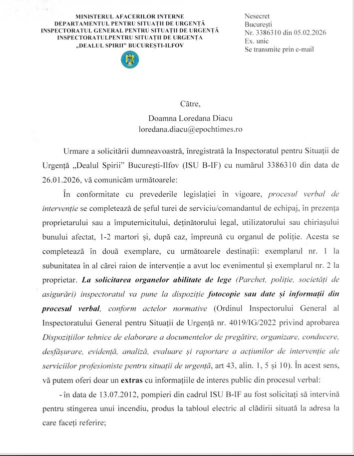 Concret, redacţia noastră a cerut o copie a raportului operativ de la intervenţia din data de 13 iulie 2012 (document în care se consemnează natura incendiului: localizat/generalizat, degajări de fum, victime încarcerate etc.), măsuri dispuse, pagube constatate etc. Nu l-am primit. ISU BIF ne-a transmis că acesta nu poate fi făcut public (nu înţelegem de ce), însă a informat că distrugerile au constat în 6 metri liniari de cabluri. Răspunsul pompierilor NU MENŢIONEAZĂ NICIO ALTĂ PAGUBĂ.