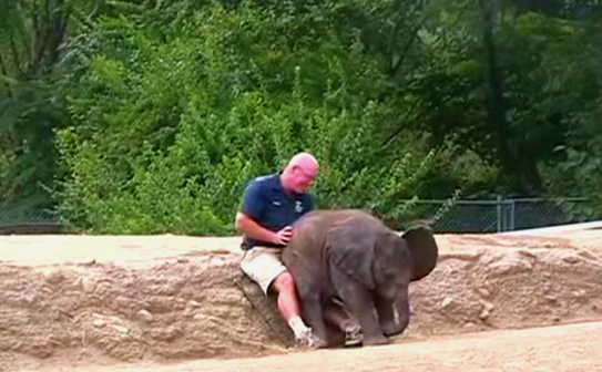 Micul elefant se duce direct la îngrijitorul său şi începe să-l tragă de picioare pentru a îl convinge să se joace cu el şi să-l mângâie. Cum vede că nu are succes, elefantul începe să-i tragă picioarele şi să le repoziţioneze astfel încât să i se poată aşeza în poală, nefiind conştient că, deşi este un pui de elefant, poate cântări şi 200 de kilograme.