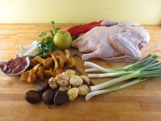 Ficatul se taie în bucăţele mai mici şi se pun într-o tigaie cu 2 linguri de ulei. După ce se rumenesc pe o parte, ficăţeii se întorc pe cealaltă parte. Se adaugă ciupercile, ardeiul, ceapa şi castanele mărunţite, şi se continuă prepararea, pentru câteva minute. Dacă din anumite considerente evitaţi călirea, umplutura este la fel de bună şi dacă amestecaţi ciupercile crude cu ceapă, ardeiul şi castanele.