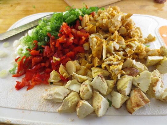 Ciupercile, ardeiul şi ceapa verde se spală bine, apoi se taie mărunt. Se iau 5-6 castane decojite şi se mărunţesc.