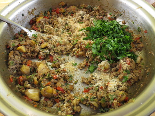 Se adaugă apoi pesmetul, frunzele de pătrunjel mărunţite şi sare şi piper după gust. Se amestecă bine până când se omogenizează bine compoziţia de umplut.