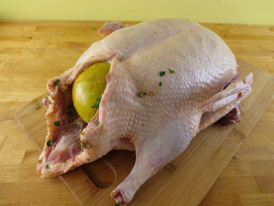 Raţa se clăteşte cu apă rece, apoi se zvântă folosind prosoape de hârtie. Se taie excesul de grăsime de pe pielea gâtului şi secţiunea de la coadă, sau de sub piele dacă este necesar. Raţa se condimentează cu sare, piper şi un pic de paprică.