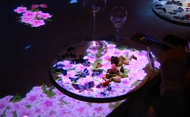 Restaurantul Sagaya din Tokio, Japonia, care serveşte în principal preparate pe bază de carne friptă, a lucrat cu organizatorul de expoziţii de artă TeamLab pentru a crea o experienţă culinară care îţi fură privirea. Păsări zboară deasupra farfuriei iar petalele de flori de cireş plutesc pe lângă dumneavoastră în timp ce, cele patru anotimpuri se scurg pe rând. Un adevărat Paradis! Proiecţia şi sunetul detectează mişcările persoanelor care servesc masa şi se schimbă în funcţie de acestea.