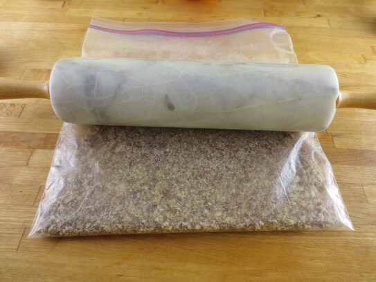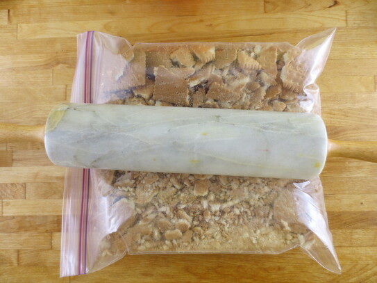 Mai întâi se începe cu sfărâmarea biscuiţilor. Biscuiţii se pun într-o pungă de plastic cu pereţii puţin mai groşi şi se strivesc cu ajutorul unui sucitor sau a unei sticle. În final se obţine un amestec de făină de biscuiţi, printre care se văd şi bucăţele mai mari de biscuiţi.