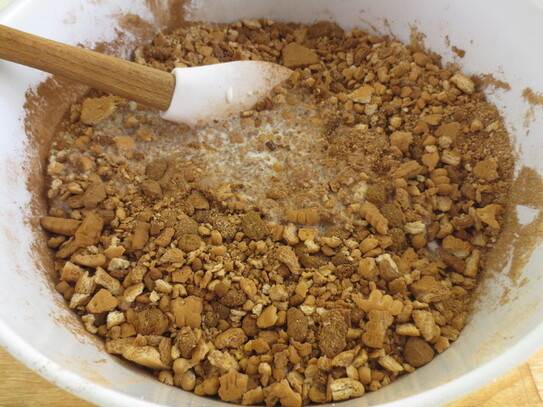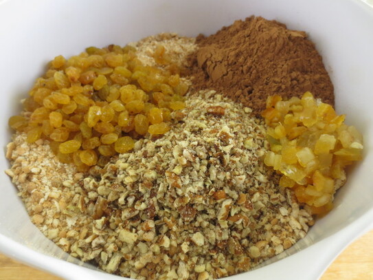 Biscuiţii se transferă într-un bowl, după care se adaugă nuca zdrobită, stafidele, coaja de portocală confiată şi cele cinci linguri de cacao. Se amestecă totul bine.