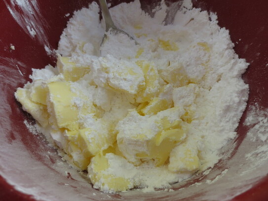 Într-un vas mai mic, se amestecă untul cu zahărul pudră până când acesta se topeşte şi se obţine o cremă spumoasă. Crema astfel obţinută se pune în amestecul de biscuiţi, şi se amestecă din nou până când se omogenizează.