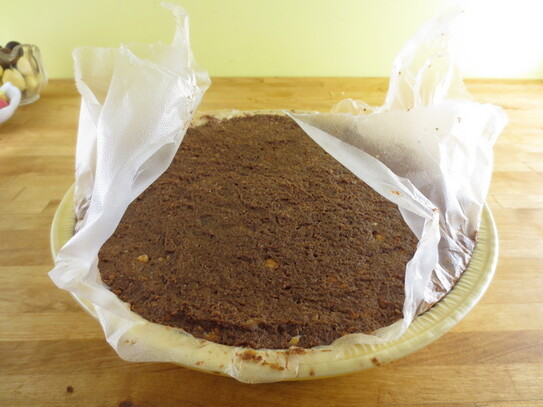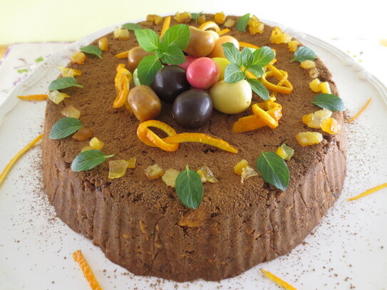 După ce s-a răcit bine, tortul se răstoarnă pe un platou, după care se îndepărtează atât forma cât şi foiţa de plastic. Se pudrează cu praf de cacao, apoi se decorează cu bombonele şi feliuţe din coji de portocale, sau după preferinţă.