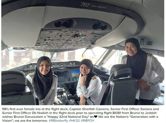 ''Primul trio feminin din cabina de pilotaj. Comandantul Sharifah Czarena şi ofiţerii Sariana Nordin şi Dk Nadiah, înainte de a porni în zbor, zborul BI081 din Brunei în Jeddah, vă doresc 'Fericire în cea de-a 32-a Zi Naţională'. Suntem o generaţie cu un scop, noi suntem viitorul''.