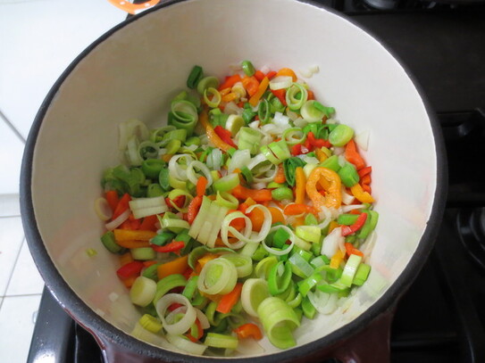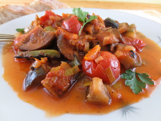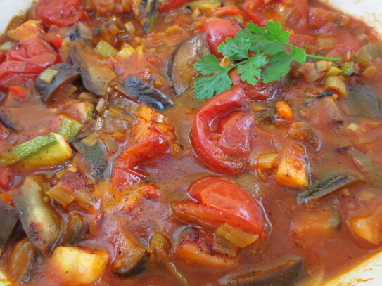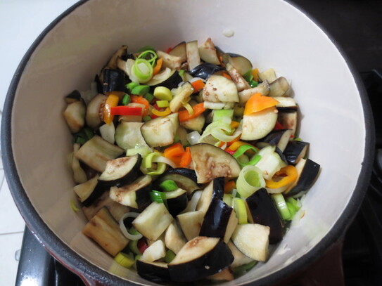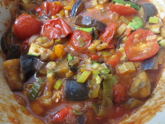 Ceapa şi prazul se înăbuşe în ulei pentru 2-3 minute, apoi se adaugă ardeii şi vinetele. Se fierb în continuare cam 5 minute, după care se adaugă roşiile şi bulionul. După un sfert de oră de adaugă dovleceii tăiaţi în bucăţele. Mâncarea de legume e gata atunci când legumele sunt pătrunse. Se adaugă sare şi piper după gust. opţional, dacă aveţi la îndemâna puteţi adăuga o linguriţă de sumac.