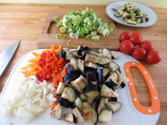 Se începe mai întâi cu pregătirea legumelor: vânăta se taie în cubuleţe, care apoi se presară cu sare, şi se lasă timp de câteva ore într-o sită de plastic, pentru a elimina substanţele amare din vânătă; ceapă se curăţă şi se taie mărunt; prazul se taie în rondele, apoi se spală bine sub jet de apă, pentru a îndepărta eventualele firicele de nisip rămase printre frunze; roşiile se taie în bucăţi de mărimea unei jumătăţi de nucă, iar dovleceii se taie în fâşii cubice de 2 cm lungime.