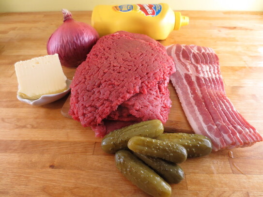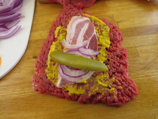 Pe fiecare felie se întinde un strat subţire de muştar, după care, la unul din capete se pune o jumătate de felie de slănină, câteva felii subţiri de ceapă şi opţional, o felie de castravete murat.
