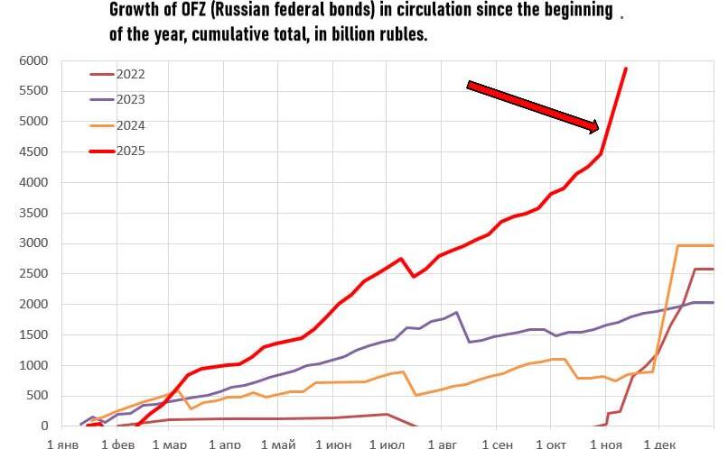 "Mai jos vedeţi cum Rusia intră în faliment parabolic. În roşu vedeţi care e dimensiunea deficitului în cursul anului 2025 (în roşu) faţă de anii precedenţi. Erau deja rău - acum e situaţie exponenţială haos. Şi încă nu au venit cheltuielile pe decembrie care întotdeauna sunt enorme. Practic sunt în cădere liberă acum fără paraşută. Bani în fondul suveran? Nu mai sunt. Nu mai pot vinde petrol mai deloc (şi ce vând e cu discount de 20 dolari pe baril pentru că e super riscant să cumperi aşa ceva) deci bani nu mai intră neam de neamul lor", a afirmat Andrei Caramitru.